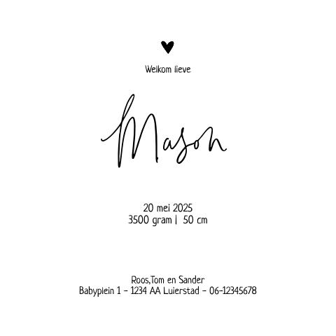 Minimalistisch zwart wit geboortekaartje met hartje en foto